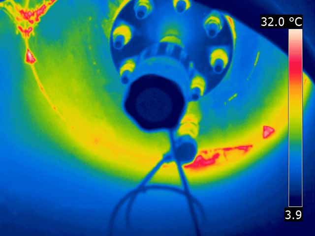 W przypadku rurociągów, wymienników ciepła lub chłodnic ich obraz termowizyjny przy odpowiedniej różnicy temperatur, może wskazywać intensywność przepływu czynnika i pozwala zidentyfikować ewentualne niedrożności i zanieczyszczenia powierzchni wewnętrznych (np. kamień kotłowy).
