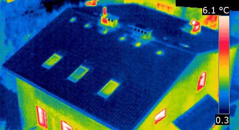 Dachy ze względu na swoją funkcję i budowę stanowią rodzaj konstrukcji, którą najtrudniej poddać analizie termograficznej. Analiza taka jest szczególnie trudna lub prawie niemożliwa do wykonania z zewnętrznej strony przegrody,przy dachach płaskich lub o niewielkim nachyleniu. Wynika to z braku widoczności połaci dachowych lub ich widoczności pod kątem, pod jakim temperatura odczytana z termogramu obarczona jest dużym błędem wynikającym z odbijania się nieboskłonu. Odbicia nieboskłonu (zwłaszcza przy bezchmurnym niebie) w sposób znaczący wpływają na odczyt temperatury powierzchni dachów nachylonych także pod większym kątem, nawet powyżej 45 stopni.