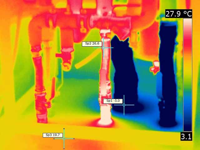 W przypadku rurociągów, wymienników ciepła lub chłodnic ich obraz termowizyjny przy odpowiedniej różnicy temperatur, może wskazywać intensywność przepływu czynnika i pozwala zidentyfikować ewentualne niedrożności i zanieczyszczenia powierzchni wewnętrznych (np. kamień kotłowy).
